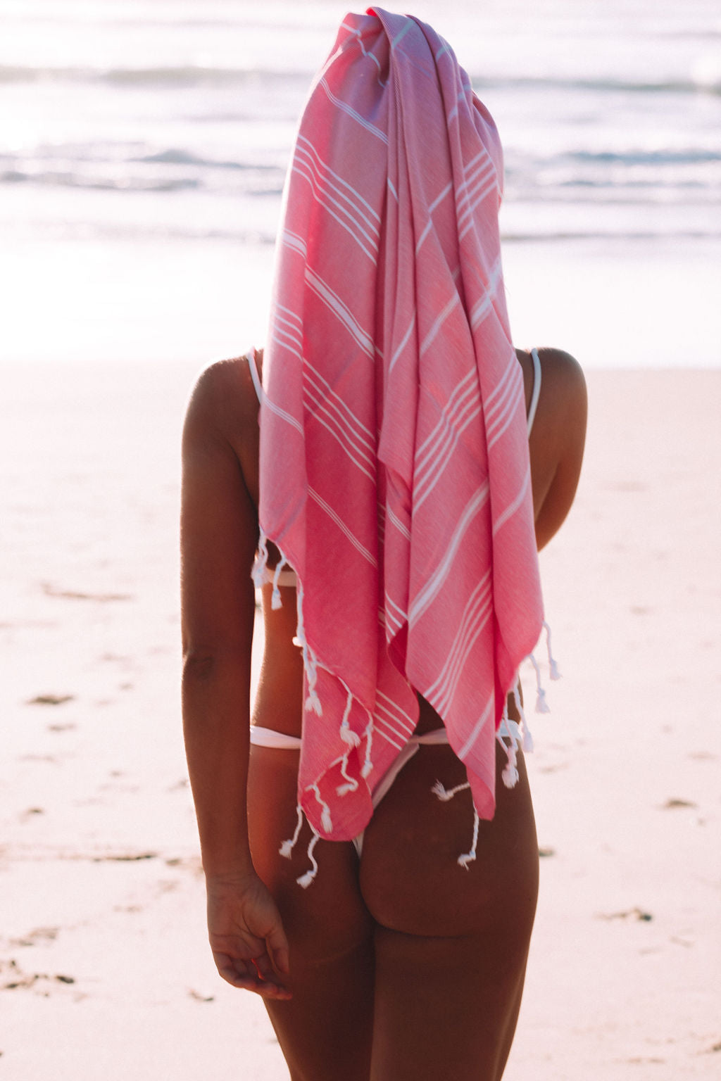 Our hot pink Turkish towel is a beautiful bright colour that won't fade. Perfect for anyone who loves pink and wants to add something fun to their beach set up. This colour also looks great as a sarong or get creative and wear it as a summer dress.